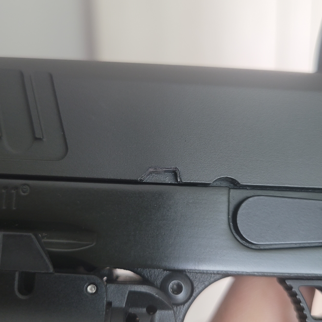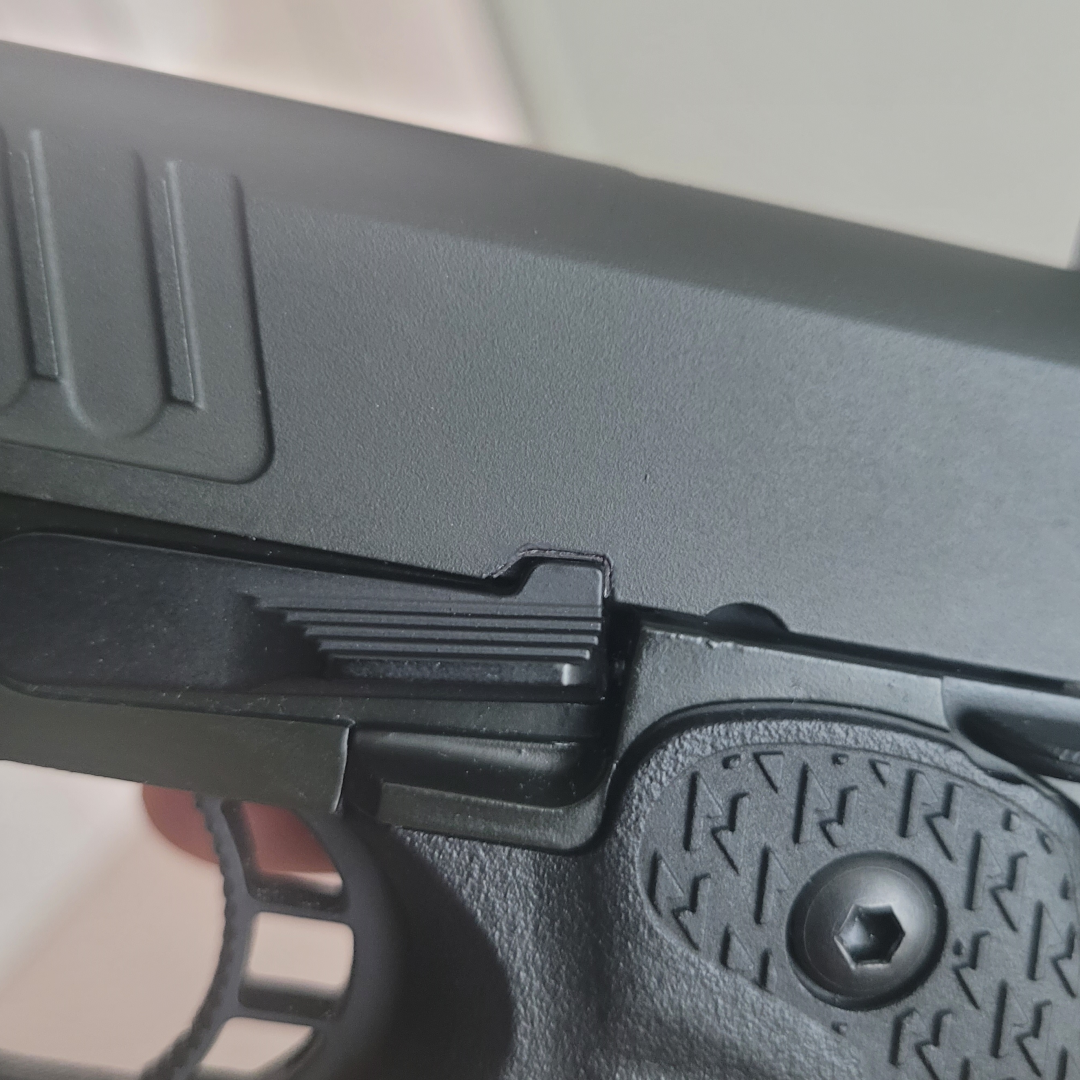1911 콜트를 베이스로 하고 있기 때문에 실총과 같이 비비탄이 모두 소진되면 탄창의 밀대가 스토퍼를 위로 올려주어 슬라이드의 노치에 걸리는 구조로 되어 있습니다.