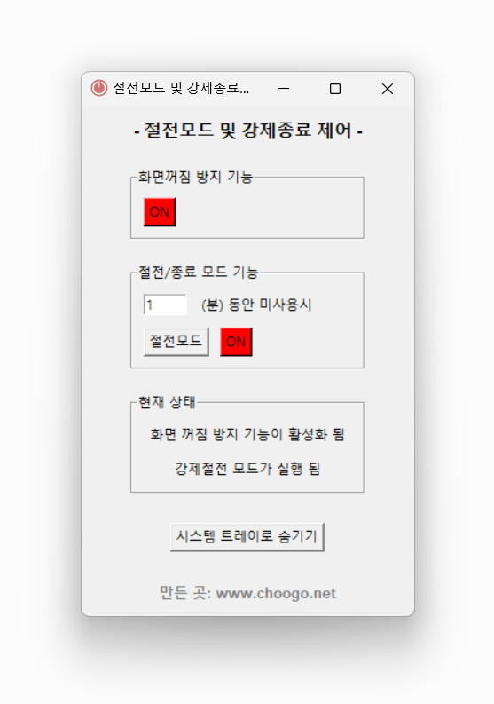 꺼짐방지나 절전방지 기능이 돌아가는지 모르고 방치하게 되는 경우를 대비해서 사용자가 설저한 시간 이상으로 컴퓨터의 사용이 없을때(마우스 움직임이나 키보드 입력 등으로 감지)에는 자동으로 절전모드나 종료모드로 전환되게 하였습니다.