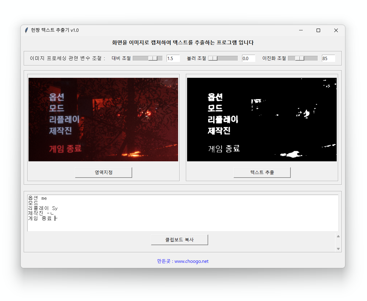 1. 개요 일전에 '헌짱 글자 추출기'라는 이미지속 문자를 추출해주는 프로그램을 업로드 한 적 있습니다.화면에 보이는 글자를 인식하여 추출해 주는 프로그램 (choogo.net)(링크) 위 프로그램은