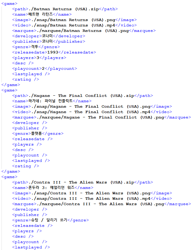 에뮬스테이션 기반의 OS에선 기종별로 게임 목록을 관리하는 방식으로 xml 이라는 문서포맷을 사용하고 있으며, 여러 메타데이터를 정해진 코드형식에 맞춰 정리하여야 게임목록의 표현이 가능합니다.