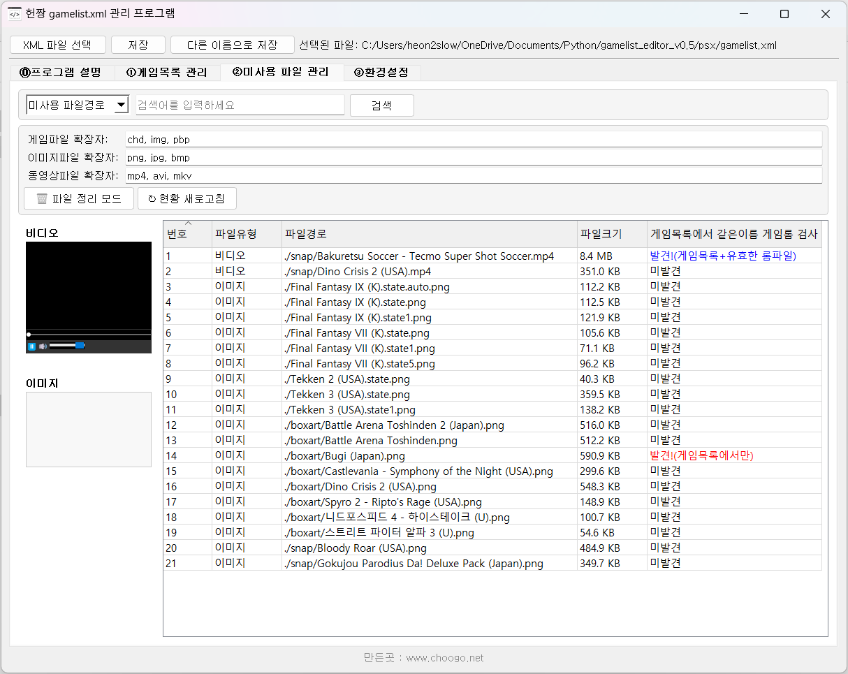 - 게임파일, 이미지, 동영상 등의 리소스가 gamelist.xml에서 참조되지 않은채 용량만 차지하는 자료를 찾아주고 삭제하거나 백업할 수 있는 기능을 제공하여야 한다.